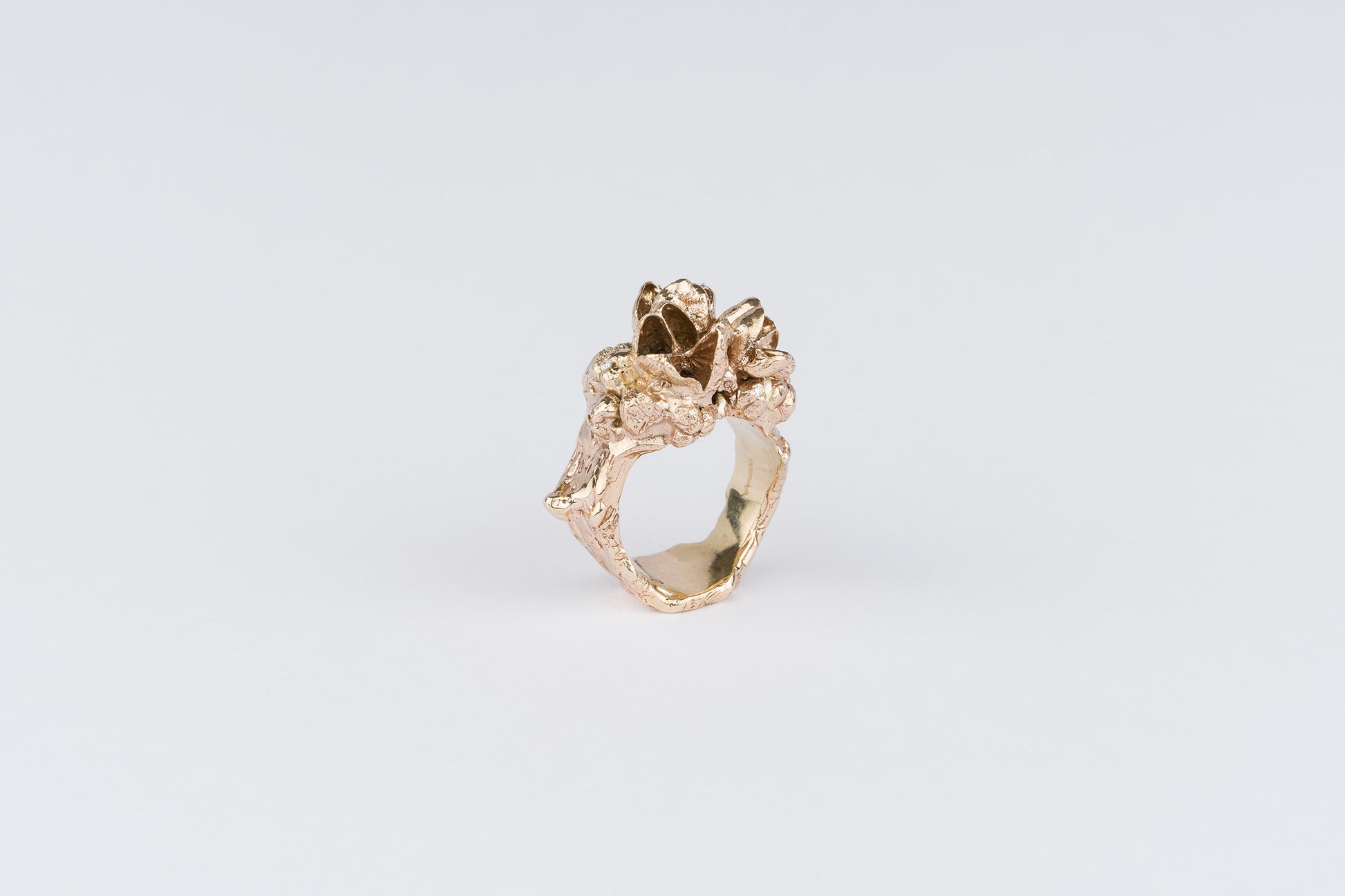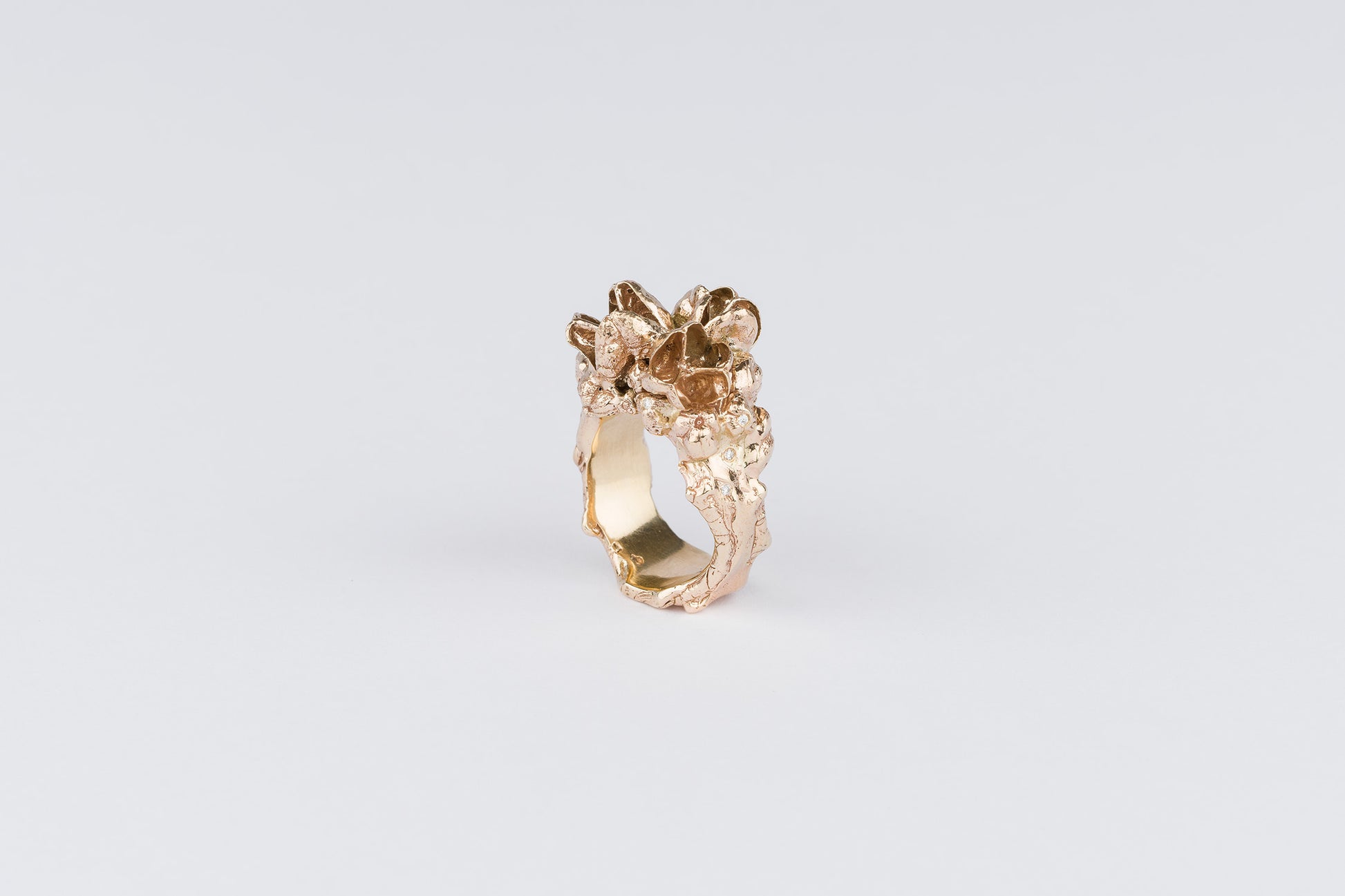 The Diamond Awakening Ring is hand carved in 9ct yellow gold and is set with 8 brilliant white diamonds, to expose the intricacies of growth.