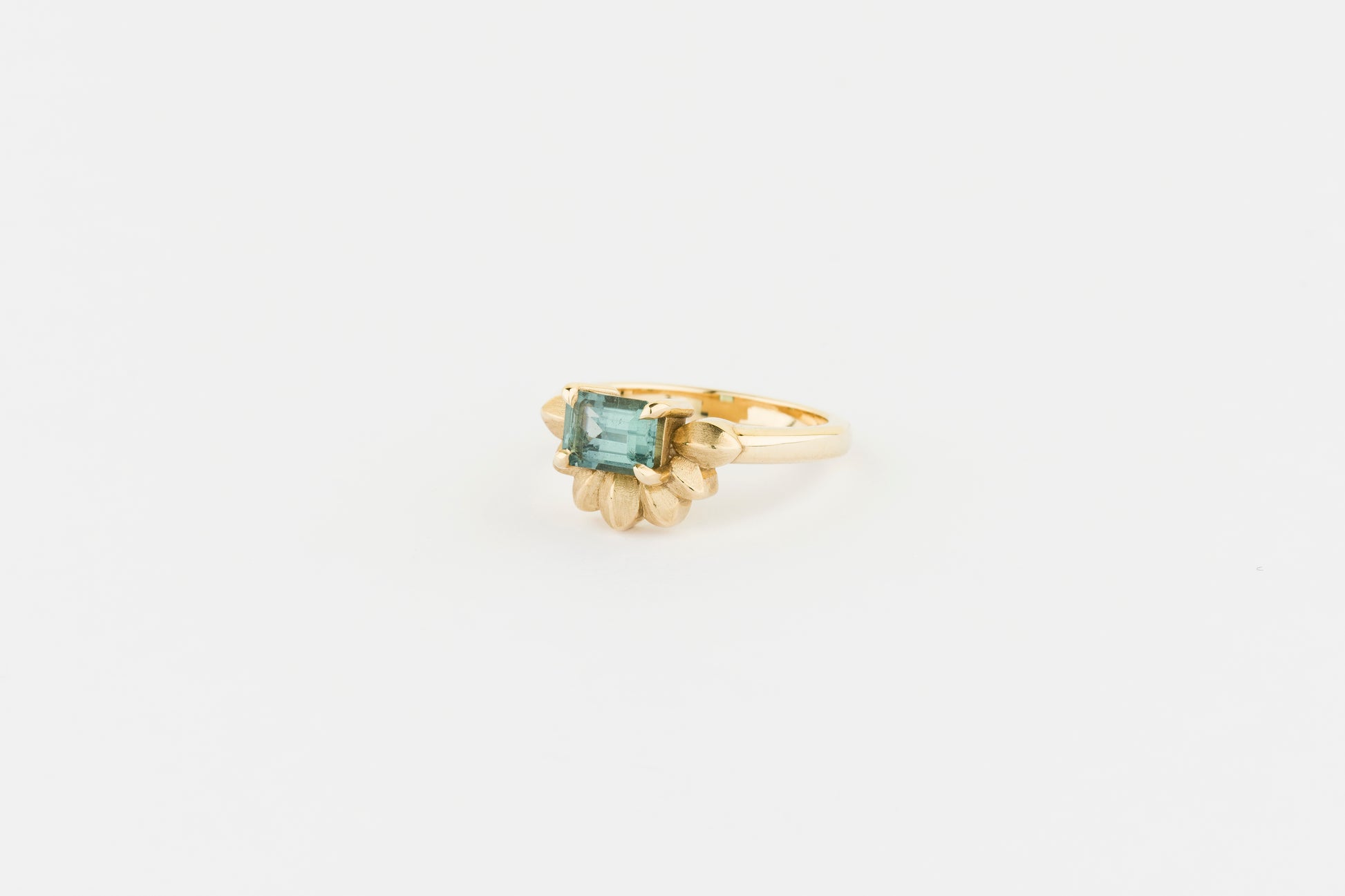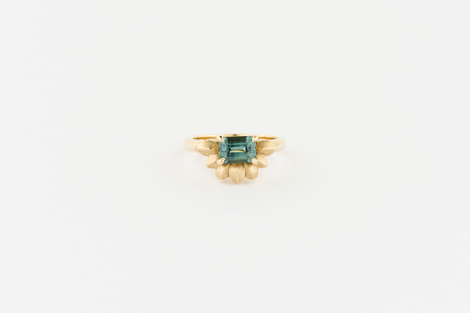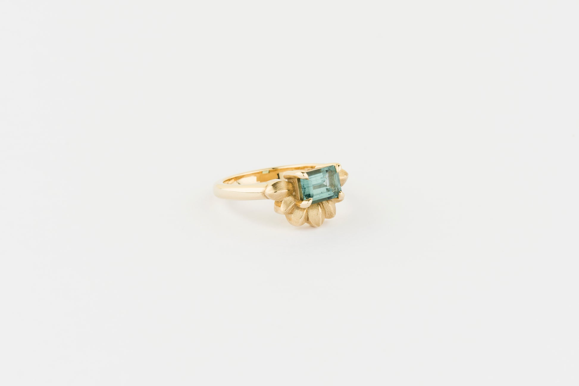 Introducing the enchanting Fondness Ring- a true embodiment of Love and uniqueness, exclusively featured in our Valentine's drop. This extraordinary ring boasts a mesmerizing yellow gold setting, cradling a captivating blue emerald cut tourmaline. A rare breathtaking choice, the tourmaline is skilfully surrounded by delicate petal details, gracefully adorning half of the stone.