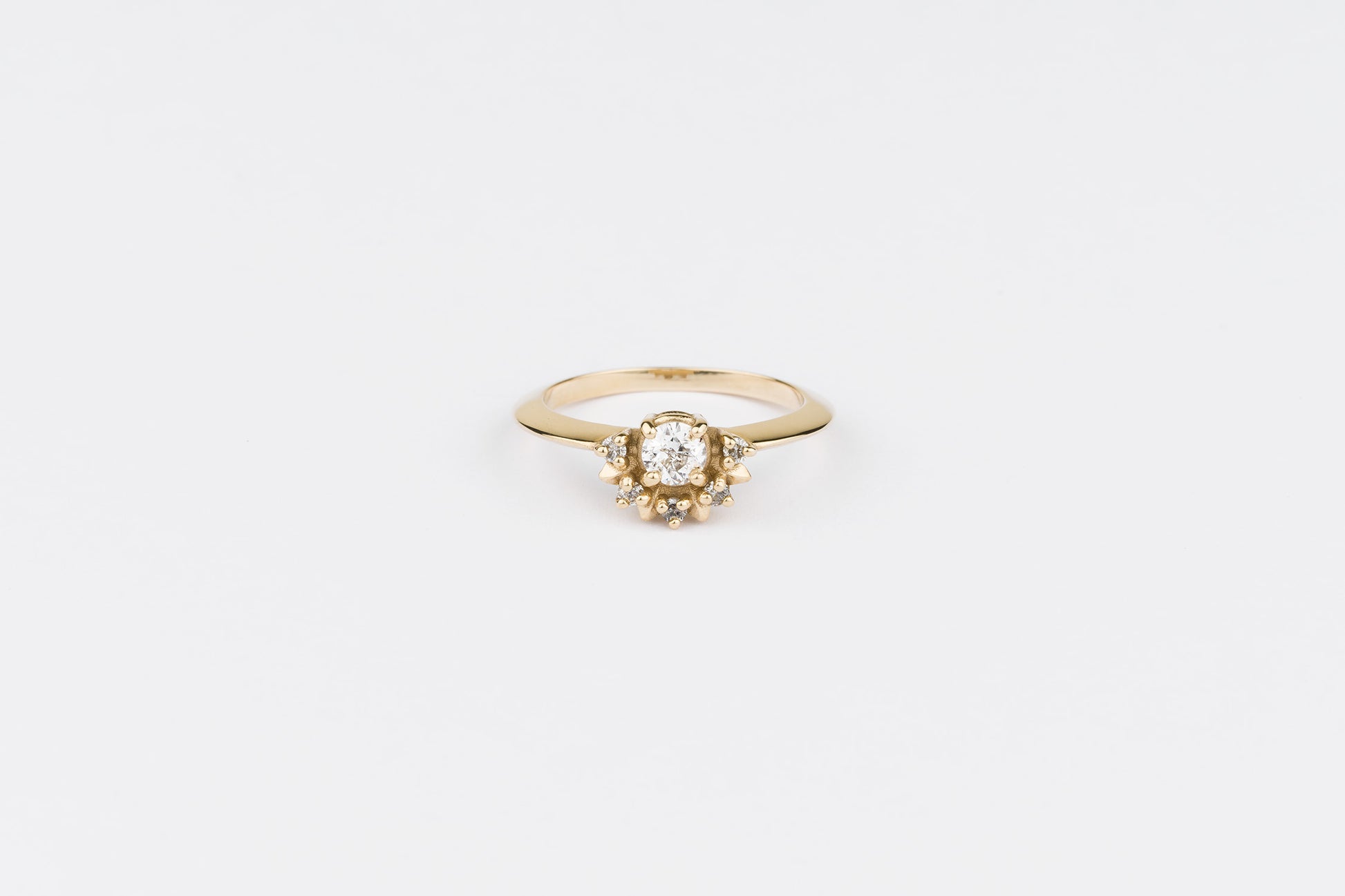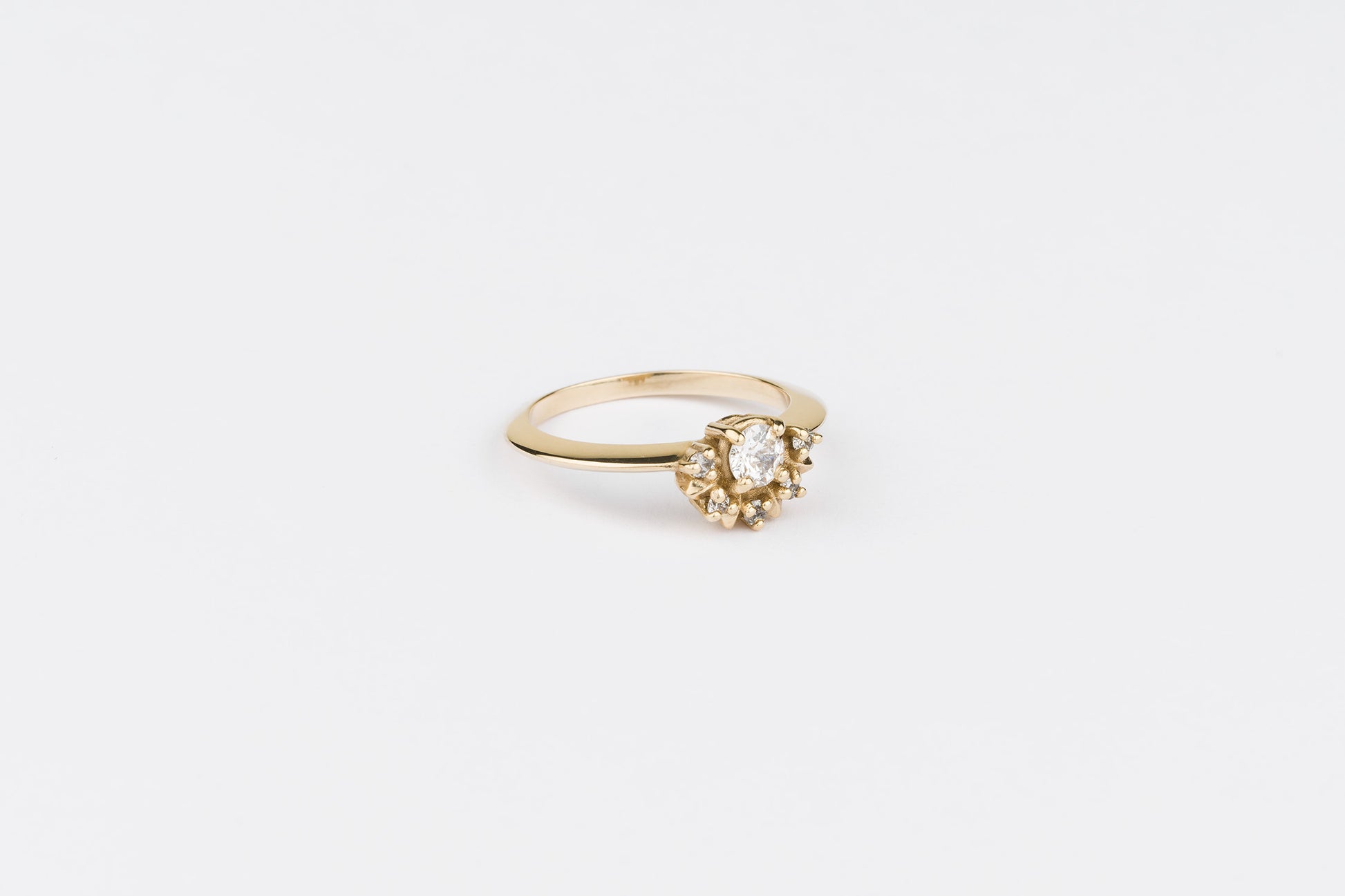 The Lisa Ring is a beautifully ornate contemporary engagement ring. This ring is the first of our designs to be set with a central lab grown diamond with small accent diamonds.