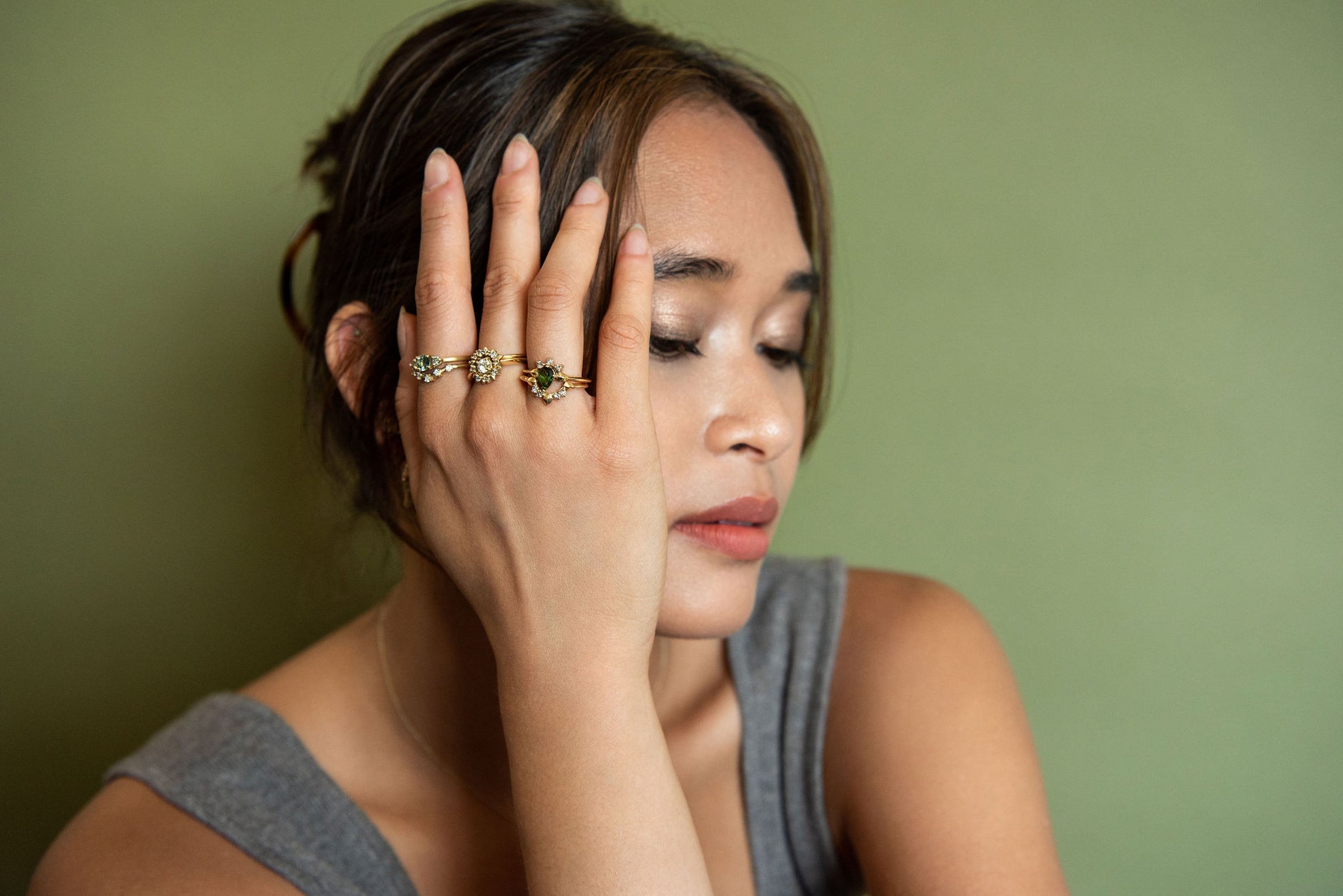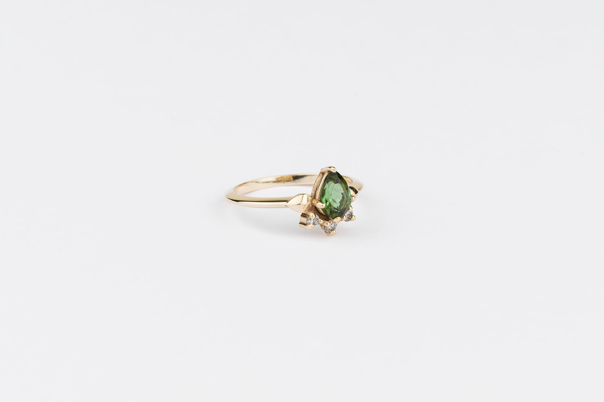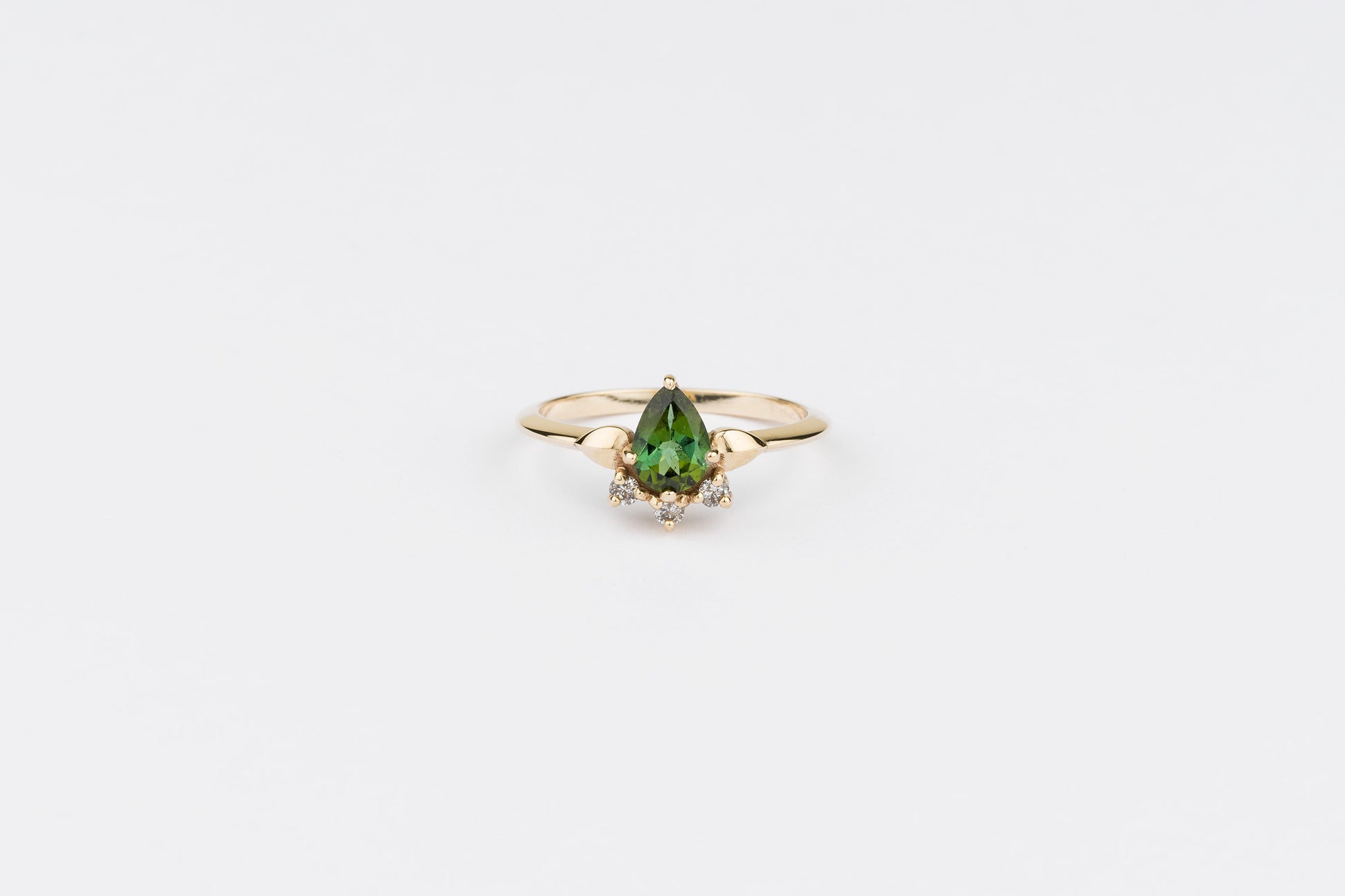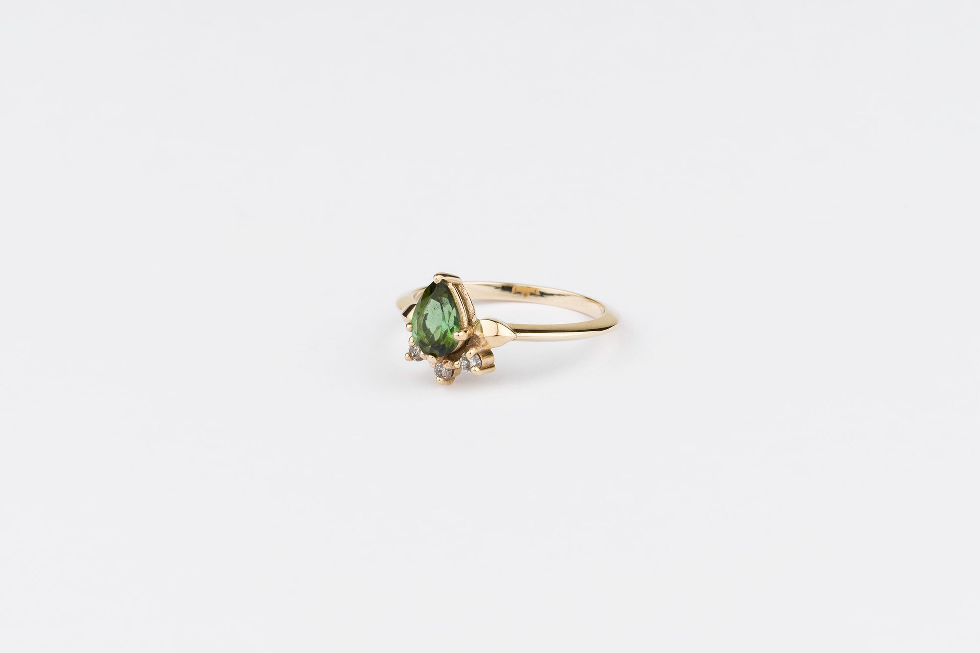 The Lynsey Ring is a contemporary twist on the traditional engagement ring. Designed with nature in mind it is set with a stunning pear shaped green tourmaline enhanced with accent diamonds.