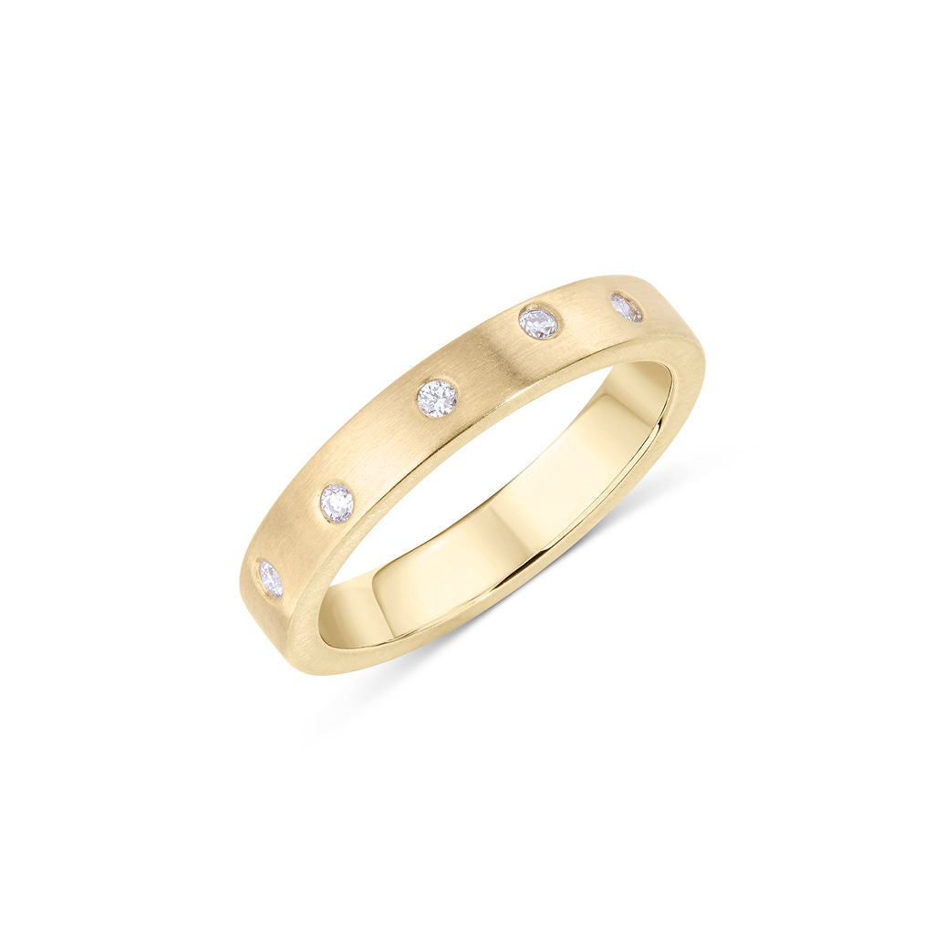 The Scatter Band is a minimal wedding band design set with small diamonds asymmetrically. It has a soft matte finish giving it a contemporary feel.