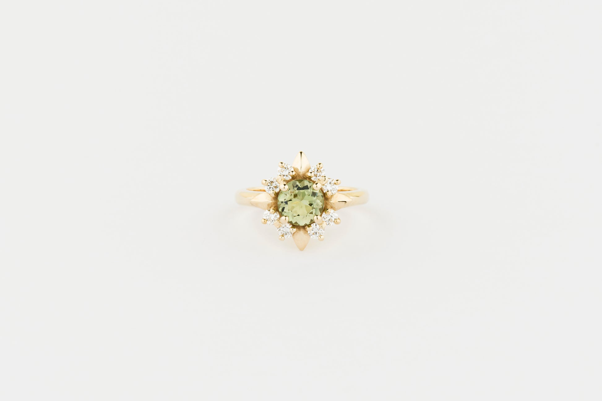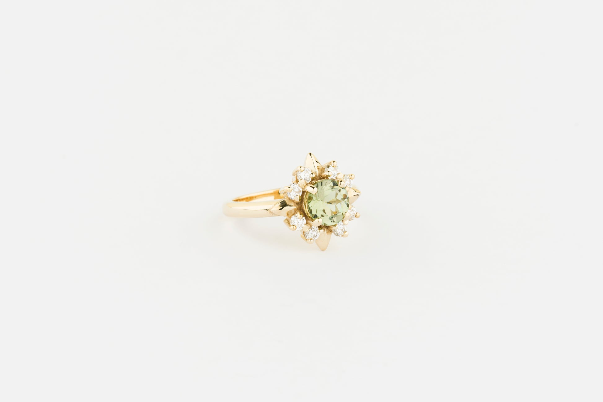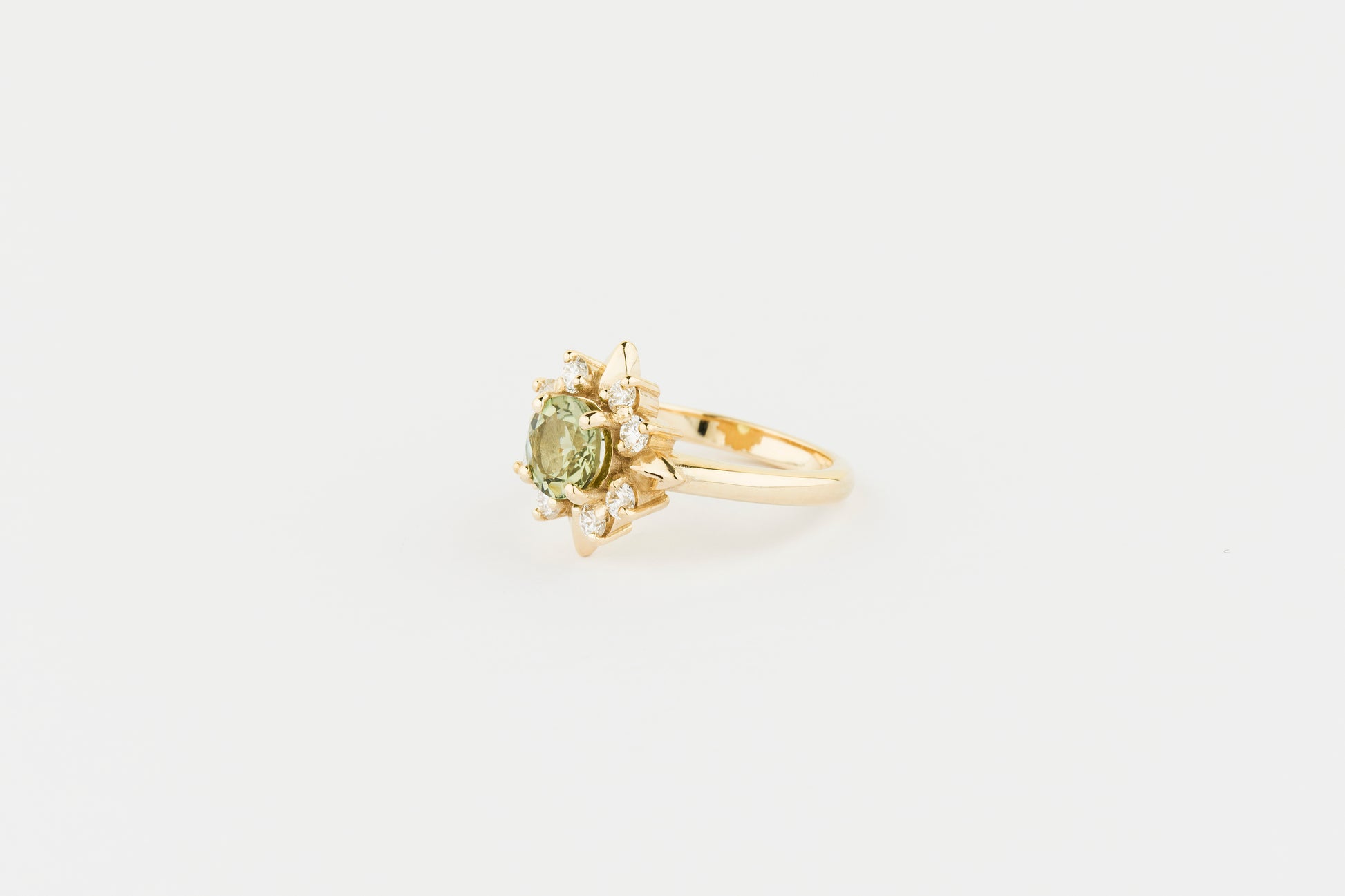 Introducing the exclusive 9ct yellow Gold round tourmaline and diamond cluster- a true masterpiece and one of a kind treasure from our enchanting Valentine's collection. This exquisite ring is a symphony of elegance, featuring a captivating green tourmaline embraced by a cluster of brilliant diamonds, creating a harmonious blend og colour and sparkle.