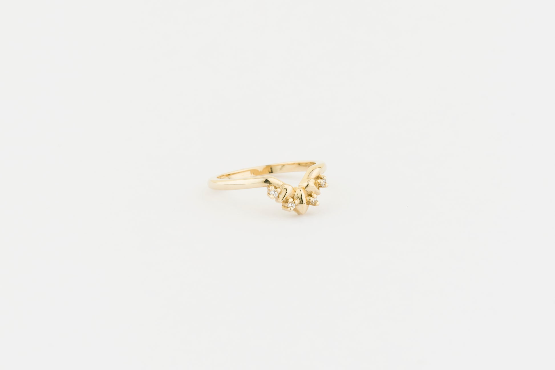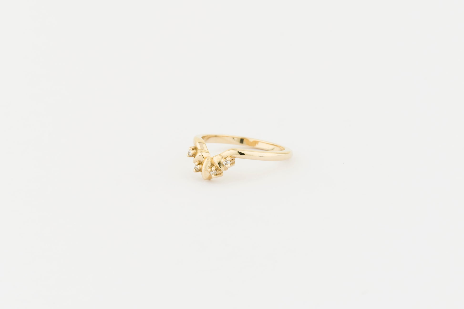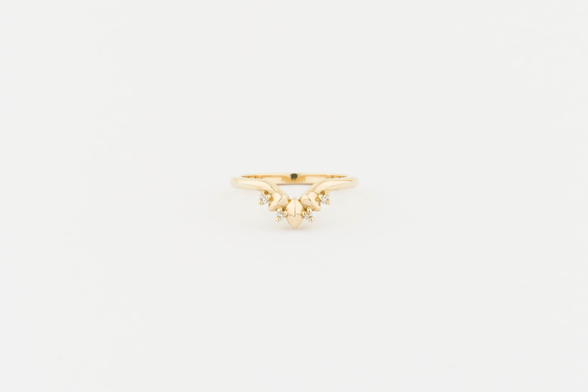 An alternative wedding or commitment ring designed to compliment and frame an engagement ring or as a stand alone piece. With delicate petal forms and small diamonds.
