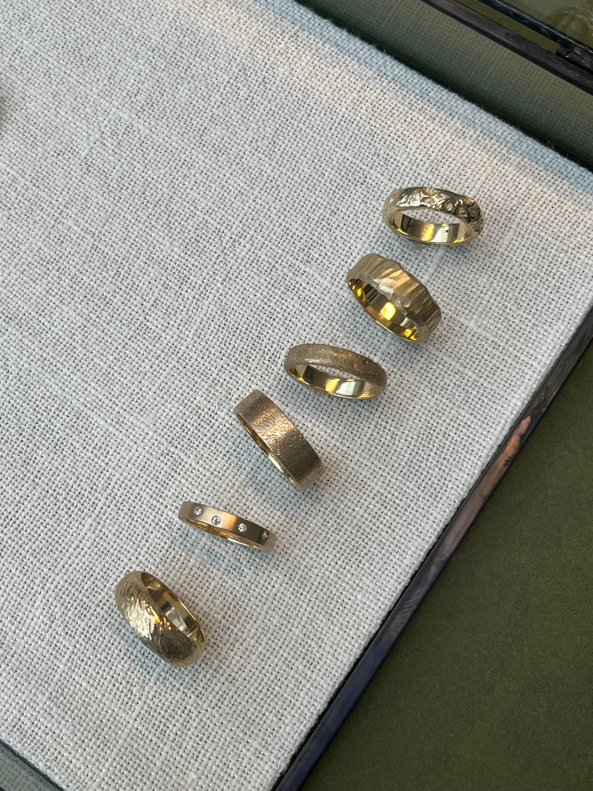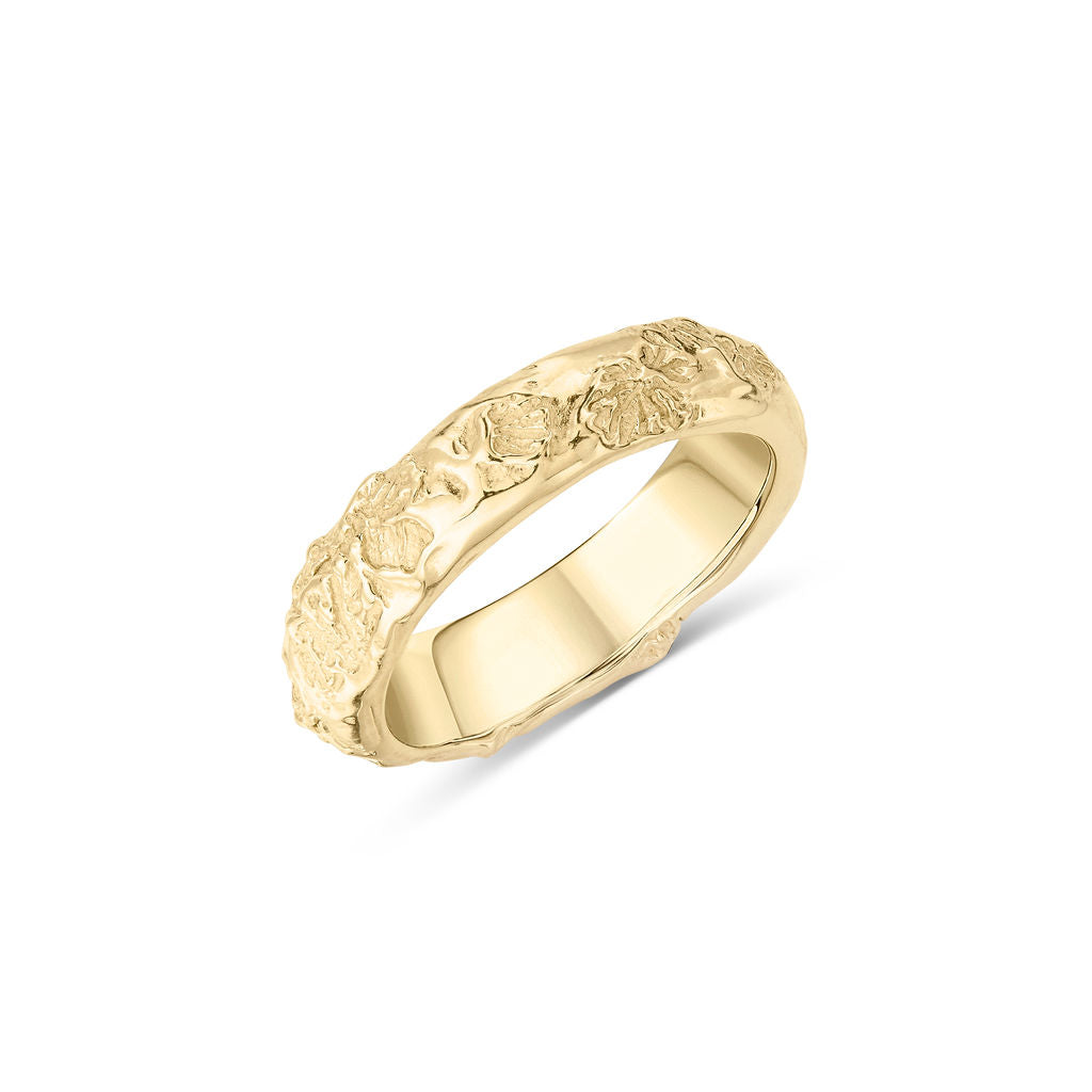 A heavy gold band with traces and impressions of plant keepsakes, giving it a polished imperfect aesthetic.